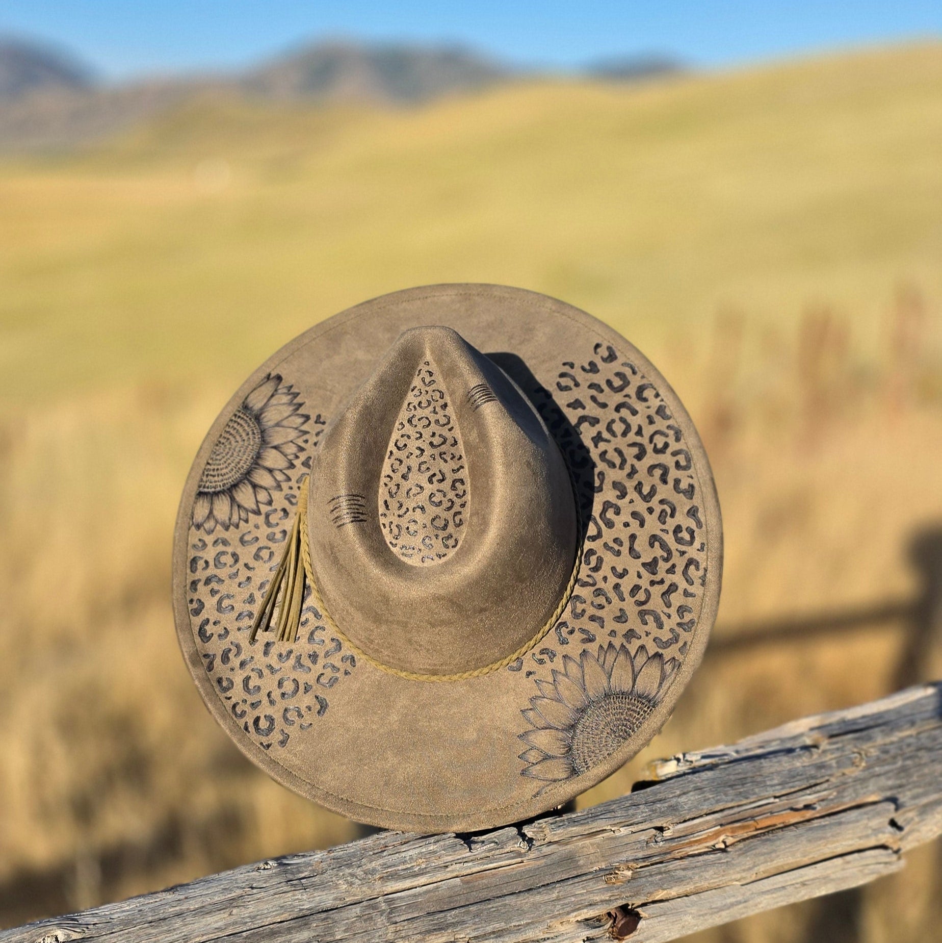 This modern flat-brim hat features hand-painted cheetah print details with bold sunflowers blooming across the crown — a fierce and feminine blend of wild spirit and western soul. The structured flat brim adds a clean, confident edge to any outfit. Made from soft vegan suede with an adjustable inner band that fits most head sizes from 20"–24.5" (6 3/8 – 7 5/8). Designed for the ones who bring sunshine and grit wherever they go.