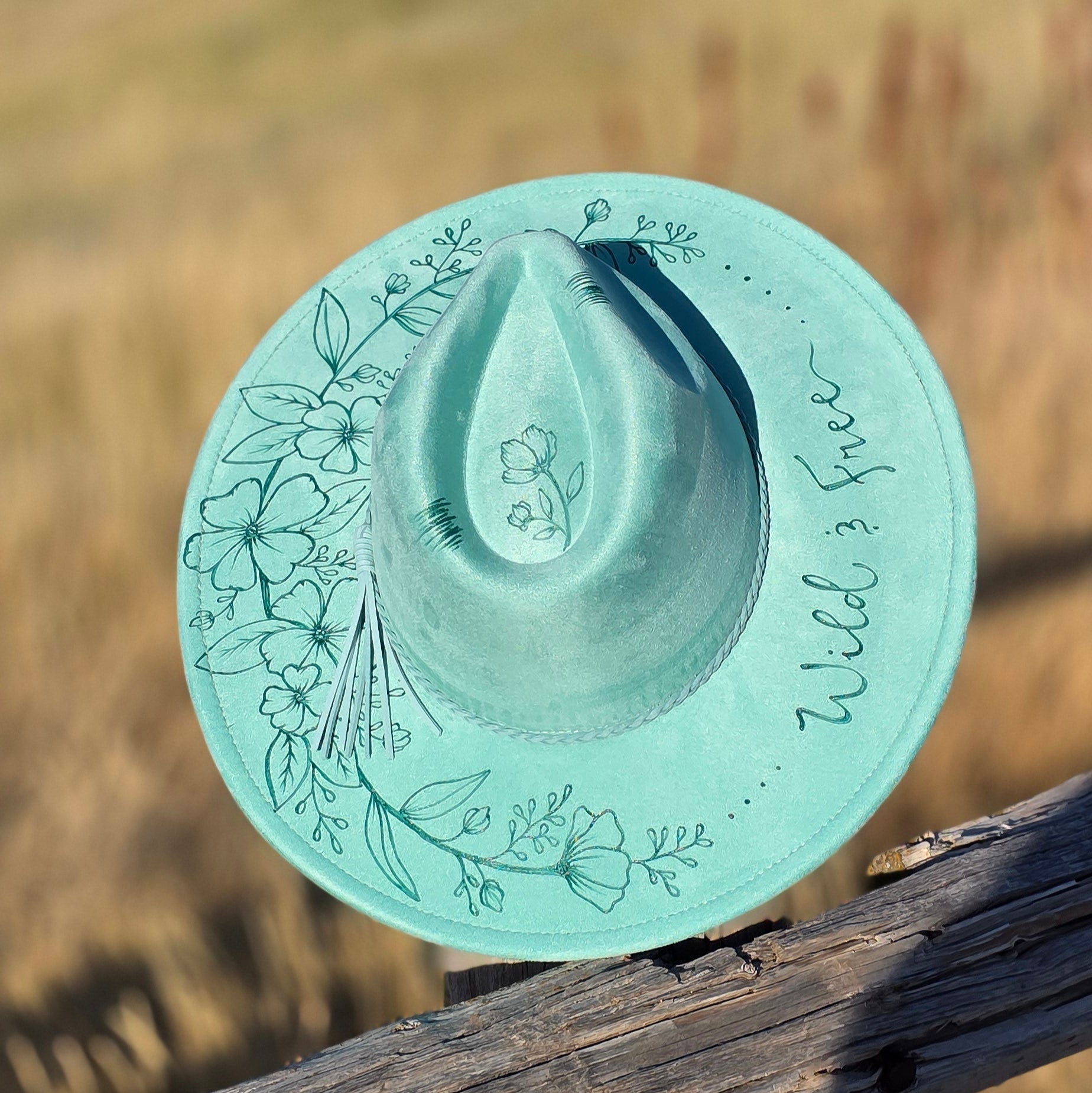 This handcrafted vegan suede hat blends rustic western charm with a touch of free-spirited artistry. Featuring a detailed floral design paired with the words “Wild & Free” burned into the brim, it’s perfect for those who live life without limits. The structured shape offers a modern yet timeless look, while the adjustable inner band ensures a comfortable fit from size 20"–24.5" (6 3/8 – 7 5/8). Whether on the ranch, at a festival, or on a weekend adventure, this piece is a bold reminder to embrace your untamed side.