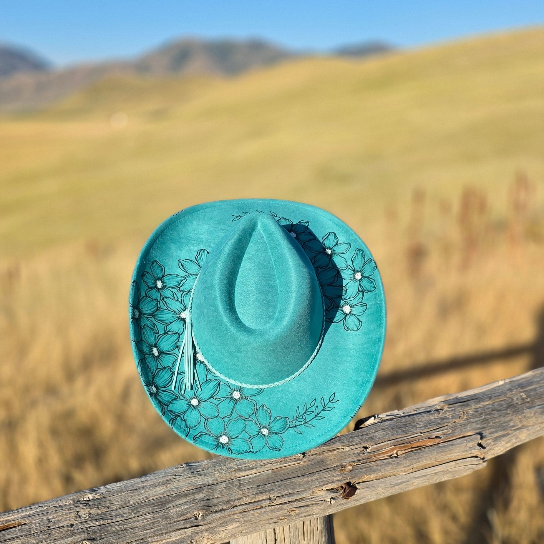 This hand-designed turquoise beauty features delicately wood-burned primrose flowers with white painted centers, adding a soft floral contrast to its vibrant color. The cowboy-style brim curves upward on each side, giving it that timeless western silhouette with a modern edge.